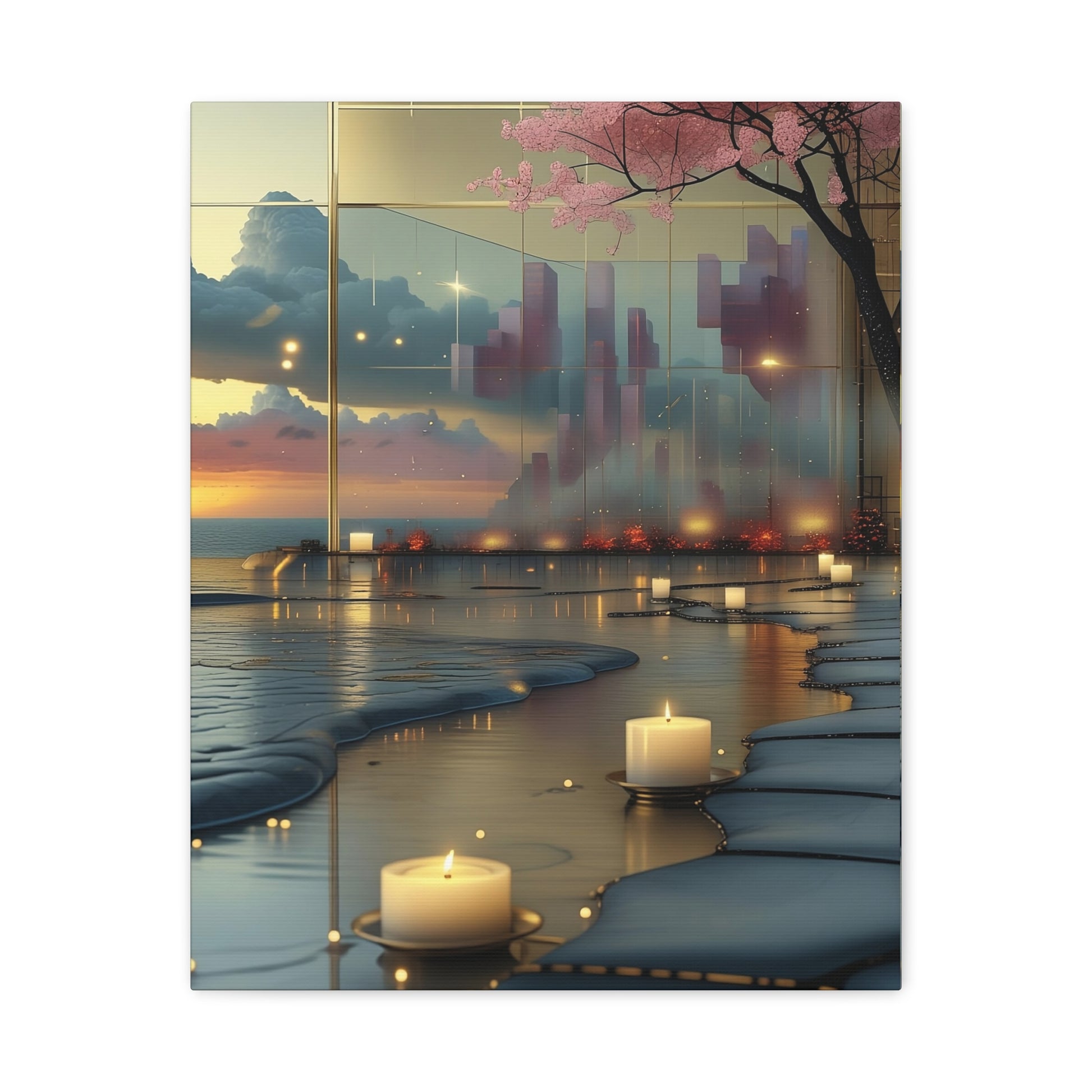 Soft candlelight, cherry blossom whispers, and a golden horizon — this art print turns any space into a healing retreat.